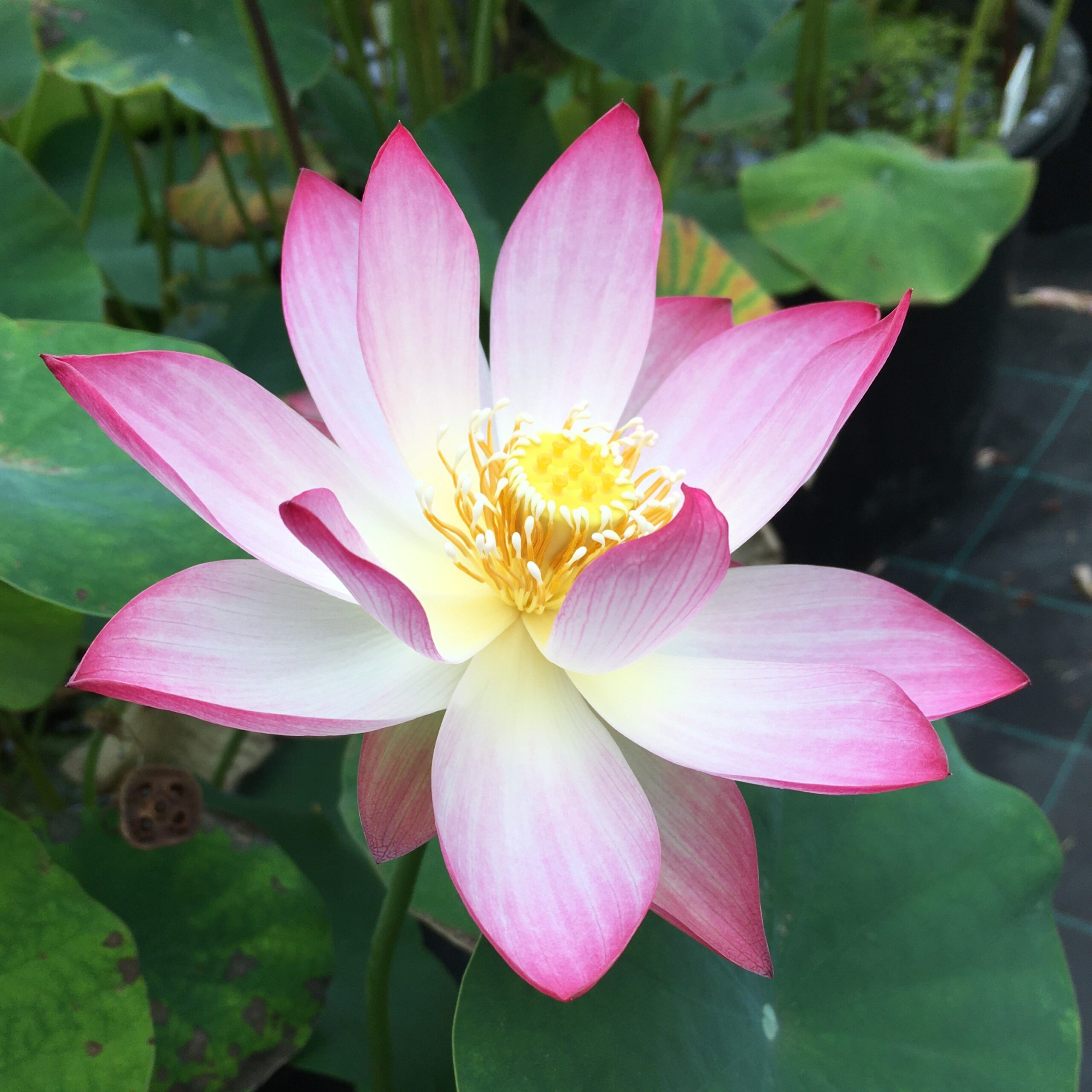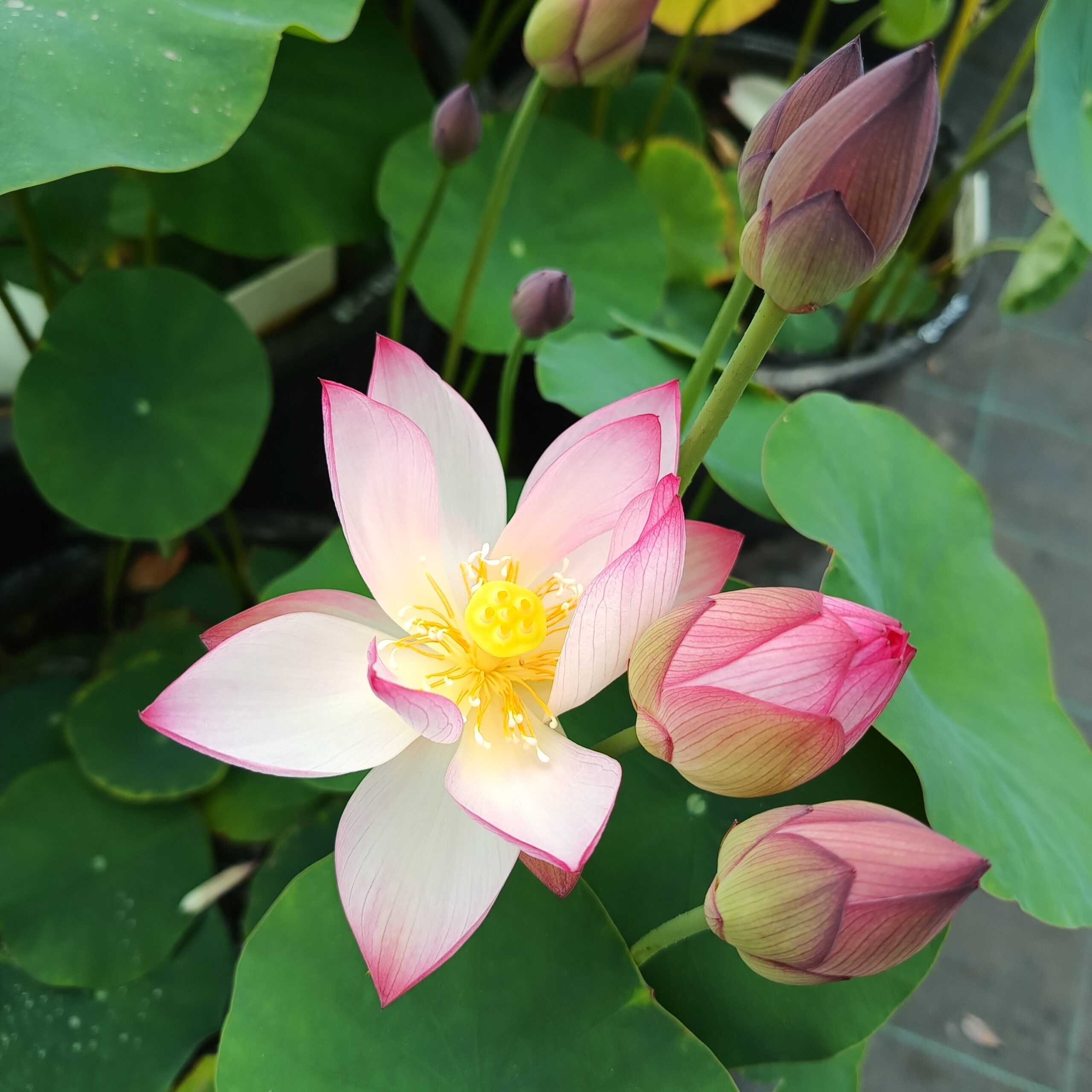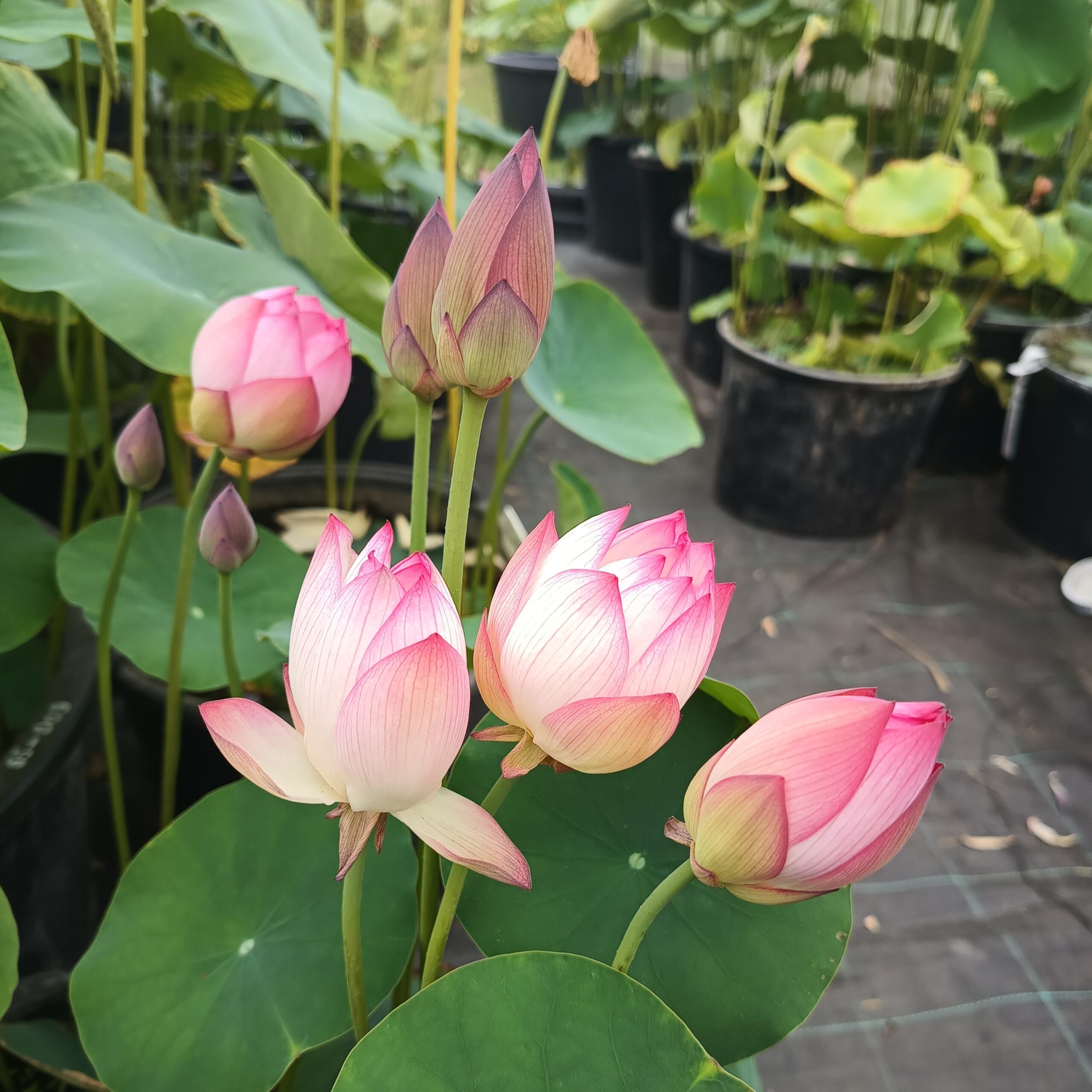 Miniaturowy lotos 'Cong Ke’ należy do ścisłej czołówki najczęściej kwitnących odmian. W 2025 roku uzyskaliśmy 24 kwiaty w 20-litrowym pojemniku.