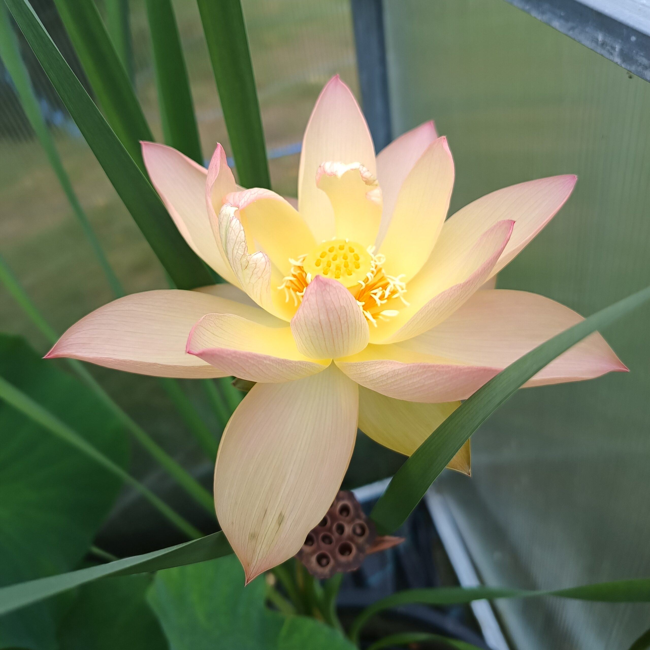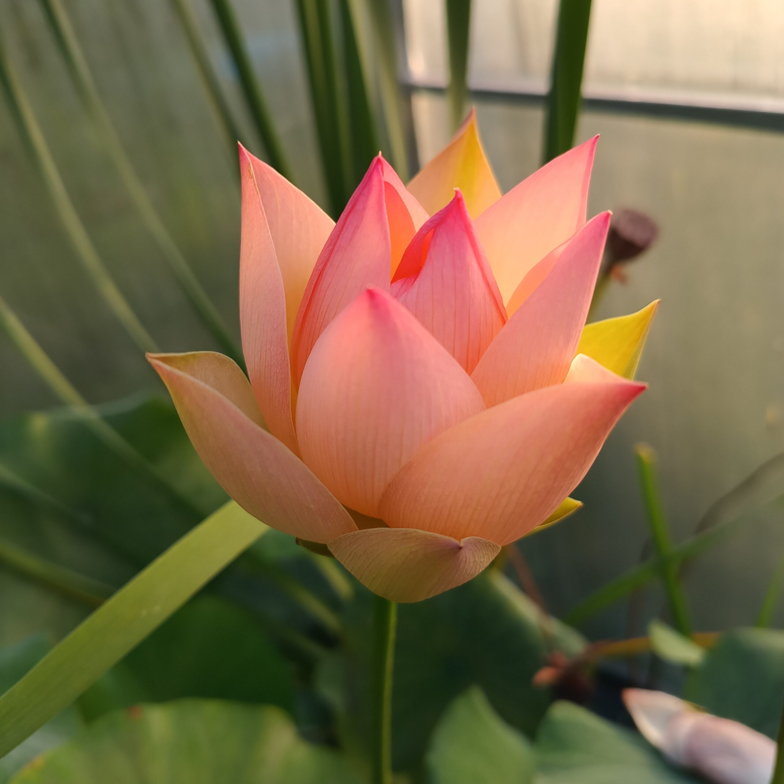 Średniej wielkości odmiana o nietypowych jak na lotos, łososiowych kwiatach. Na wierzchołkach płatków dominuje róż, który płynnie przechodzi w żółte odcienie w kierunku centrum kwiatu. 'Golden Sunset’ bywa nazywany pierwszym pomarańczowym lotosem.